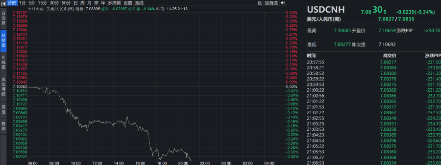 11月25日,离岸人民币、在岸人民币兑美元汇率均升破7.09关口,触及逾一年盘中新高。同日,中国人民银行授权中国外汇交易中心公布,当日银行间外汇市场人民币汇率中间价为1美元对人民币7.0826元,相较前一交易日中间价调升21个基点。今年以来,人民币中间价年内涨幅约1000个基点。